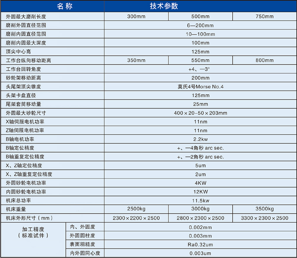 ● 本機床為三軸(砂輪架橫向進給X軸、工作臺縱向運動Z軸、砂輪架底座分度回轉B軸)二聯動數控萬.能外圓磨床,數控系統采用國際或國內知名品牌。具有自動進刀、退刀、粗磨、精磨,修正砂輪,自動補償、砂輪架自動回轉等功能,加配自動測量儀,能實現磨削循環功能的全閉環。